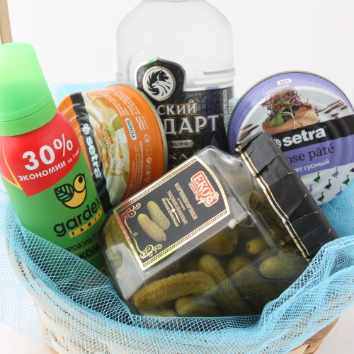 Состав: корзина, 2 паштета, водка, огурцы, спрей от комаров, поздравление, упаковка